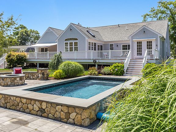Expansive ranch-style home with over 3,900 sq. ft. of finished living space in PRISTINE, move-in ready condition. Freshly painted inside and out, this property offers first-floor living with three spacious bedrooms, each with its own ensuite bath. The bright, open floor plan includes a sunroom and a cooks kitchen with a grand center island, both gas and electric cooktops, double convection wall ovens, new fridge, wine cooler, and generous seating--perfect for gathering. Outdoors, enjoy a massive Azek farmer's porch, expansive decks, and a heated plunge pool surrounded by luxurious, professional landscaping and hardscaping with fire pit. Numerous Updates include new HVAC and irrigation systems, whole home generator, exterior lighting, to name a few. The lower level adds 1,700+ sq. ft. with high ceilings, a great room, home theater, gym, office, full bath, and pool access--ideal for entertaining or flexible living. With thoughtful upgrades and stylish spaces inside and out, this home offers comfort, convenience, and a resort-like lifestyle. Close to Mashpee Commons and dining too! All info provided is deemed accurate Buyers/agents to verify/ perform due diligence.