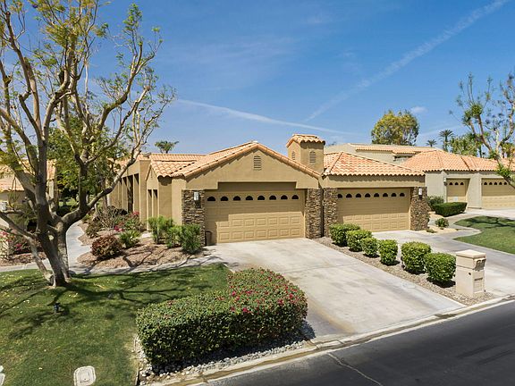 Welcome to desert living at its finest! This contemporary 2 bedroom, 2 bath condo offers stunning mountain and golf views and its own private salt water pool and spa! Overlooking the 2nd & 3rd fairways of the Pete Dye/Mission Hills Golf Course and flanked by the San Jacinto mountains, this home provides a perfect setting for entertaining and enjoying all the best the desert has to offer. The updated open concept living area features soaring ceilings and stylish modern kitchen which features updated cabinetry, granite countertops and stainless appliances. Step out of the living room and relax under the covered patio or take a dip in the refreshing pool, all while enjoying the view. A den off the living room makes a perfect home office, cozy TV room or third bedroom. The spacious primary bedroom suite boasts a large, spa-like bathroom with a sleek glass tiled custom walk-in shower. The well-sized guest room offers direct access to a stylish bathroom which guests can also utilize from the hall. Other highlights include an attached 2 -car garage, and FEE land (no land lease!) This guard-gated neighborhood also has 4 community pools & spas, and The Westin Resort is just a short walk or golf cart ride away.