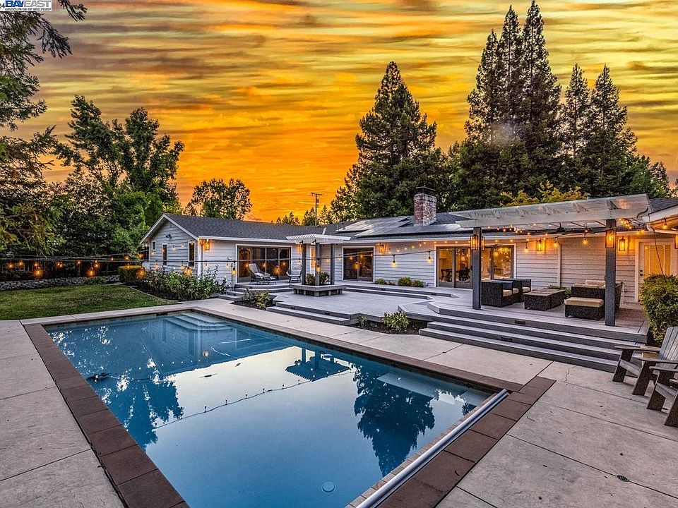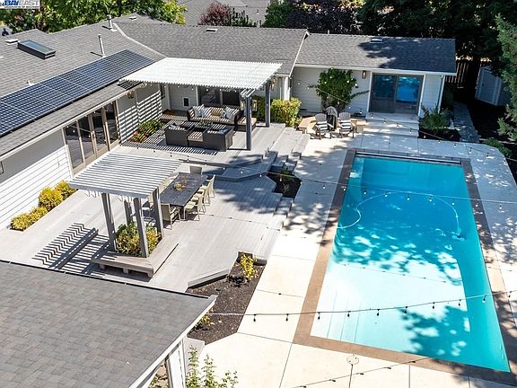 Nestled on a private street, 97 Bunce Meadows Drive in Alamo epitomizes the best of California living. This enchanting single-story home offers 5 bedrooms and 3.5 bathrooms within nearly 4,000 square feet of living space on a flat 0.62-acre lot, complete with a pool. The chef’s kitchen is equipped with quartz countertops, premium Wolf/Thermador appliances, and a cozy breakfast nook with a fireplace. The open floor plan is ideal for versatile living, featuring a separate wing perfect for an au-pair setup with two bedrooms, one bathroom, a living area, and a wet bar. The spacious primary suite includes a large walk-in closet and French doors that open to the backyard. Enjoy entertaining in your private backyard, which boasts a massive Trex deck, pool, and grassy area. The fully owned solar system minimizes your electric bills. Located close to award-winning schools, Livorna Park, and more, this opportunity is not to be missed!