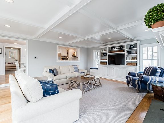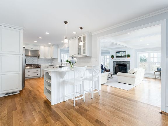 If you dream of smelling the salt air through your windows and weekends that feel like you are on vacation, then you have found your home! Thoughtful renovation inside and out has created a comfortable family home with all the modern conveniences. Inside, an updated kitchen with stainless steel appliances and counter seating opens into a picture-perfect family room with fireplace, custom built-ins and coffered ceiling. It is the ideal spot to take in beautiful sunrises. A flexible floor plan boasts an additional den, formal living room with fireplace, office with adjacent full bath, playroom with vaulted ceiling, mudroom with extensive built-ins and kids bathroom conveniently located just off the mudroom. Upstairs the MBR offers water views, 2 walk-in closets, beautiful bathroom with white marble and a private home office. There are an additional 4 bedrooms all on the 2nd floor with a new bathroom and laundry room. The backyard is perfect for games, dining by the in-ground pool and relaxing in the lower level finished entertaining room. Head to the front porch to catch up on reading or visit with neighbors as they walk past. An annual highlight is the 4th of July fireworks-enjoy from the privacy of your own deck with family and friends! Outdoor shower, irrigation system, 2 car garage, extensive foundation stonework, bluestone patio with sitting wall and so much more is offered at this wonderful home. *Home was raised and expanded in 2015 to meet current FEMA requirements.