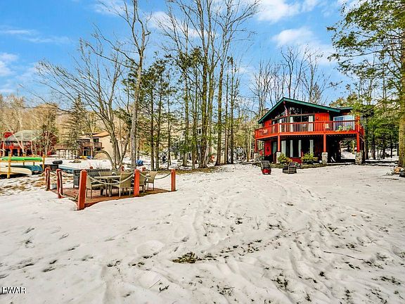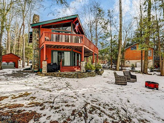 DEERFIELD LAKEFRONT HOME! Nestled along the shores of a serene 24-acre non-powerboating lake in The Hideout, a vibrant, amenity-filled community in the Northern Poconos, this exceptional property offers the perfect lakeside retreat. Situated on a level lot surrounded by tall trees yet thoughtfully cleared for lakefront enjoyment, the home boasts a large lakeside deck, a covered side patio, an upper-level deck, and a lower-level patio--plenty of outdoor space to take in the peaceful water views. Inside, the charm continues with stunning knotty pine ceilings and two inviting living rooms, each featuring an impressive stone gas fireplace. The upper-level living area includes a convenient sink for entertaining, while a fun loft adds extra character. A newly finished enclosed sunroom/office off the bedroom, complete with a mini-split A/C and heat, offers a cozy year-round retreat. With CENTRAL A/C and CENTRAL HEAT, plus a shed for additional storage, this lakefront gem is a rare find in one of the Poconos' most sought-after communities.