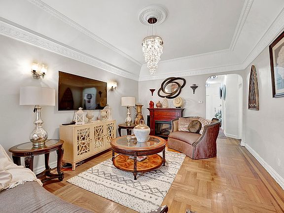 Upon entering, you'll be greeted by a spacious front porch that leads to a welcoming foyer. From here, you can either access the living room area or take a separate entry to the dining room and kitchen. The living room boasts high ceilings, exquisite crown molding, and parquet floors, while the kitchen features stainless steel appliances, an antique stove, granite countertops, and recessed lighting. The dining area even includes an AC unit in the wall for added comfort.