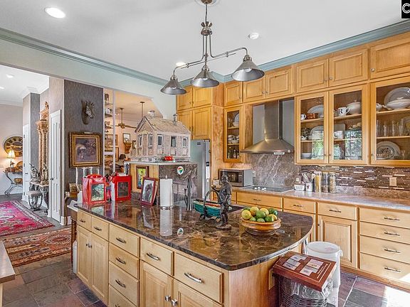 - RoomKitchenFeatures: Kitchen Island, Pantry, Recessed Lighting, Eat-in Kitchen, Cabinets-Stained, Floors-Tile, Backsplash-Other, Countertops-Marble