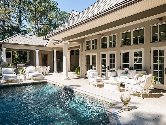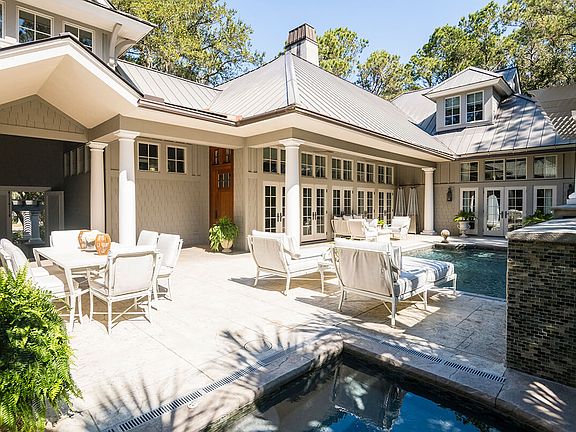 Steeped in coastal charm, this five-bedroom, five-and-two-half bath home offers the convenience of a mid-Island location and the added benefit of a corner location on a quiet street that is just a short walk to the beach along the historic allee of oaks. Golf, dining, parks, pools, fitness, and more are all a bike ride away on the Island's trail system, which lies just beyond your front door. Dressed in nature-inspired hues, the shingle-style exterior and standing seam metal roof blend seamlessly into the private, peaceful, .65-acre setting that features numerous native live oaks, pines, and palmettos. Abundant windows, vaulted ceilings, shiplap accents, and wide-plank flooring create bright, airy interiors that are reminiscent of a traditional Lowcountry beach house, yet casual elegance comes in the form of upscale finishes and architectural details. With an open concept primary living space, all ensuite bedrooms, flex space upstairs, and a handsome outdoor living area, this home comfortably accommodates multiple generations for full- or part-time living. Corner-to-corner windows on two sides of the primary living space flood the room with natural light while a vaulted, shiplap ceiling with groin accents creates height and volume. A gas fireplace is flanked by custom built-ins and creates a cozy, central gathering place for family and friends. Five pairs of French doors with transoms open directly onto an expansive rear terrace that offers year-round enjoyment with a heated saltwater pool, spa, summer kitchen, and an outdoor bath with a shower--great after a dip in the pool or returning from the beach. It also serves as a convenient dog bath. Designed for efficiency, the adjacent kitchen is anchored by a central, marble-topped island with counter seating for four, a prep sink, and storage. Custom cabinetry with glass accent panels is topped by quartz countertops, and a suite of upscale appliances includes a Wolf® range and a Sub-Zero® refrigerator and wine chiller. The master suite is located on the main floor and opens directly onto the pool deck via a pair of French doors with sidelights and transoms that stretch to the 12' ceiling. Upscale touches, such as clerestory windows, a gas fireplace, a large master walk-in closet, and coffered ceiling, join a spa-like bath with a soaking tub beneath ceiling-height windows, dual vanities, and a large walk-in shower. An ensuite guest room is also located on the main floor and features a gracious bath with dedicated wet area that contains a walk-in rain shower and claw foot tub. The second floor is home to a guest room with full bath and a family room with wet bar and half bath. Both rooms feature vaulted, shiplap ceilings. A charming guest house complete with vertical shiplap wainscoting and vaulted ceilings offers two additional guest suites and a kitchenette. This home is offered partially furnished with a Kiawah Island Club Membership. Other notable features include new landscape lighting, whole home sound system, three dehumidifiers, and a commercial grade wall-mounted power washer in the garage.