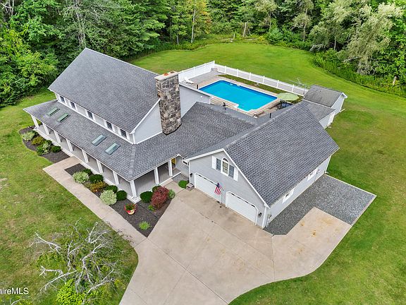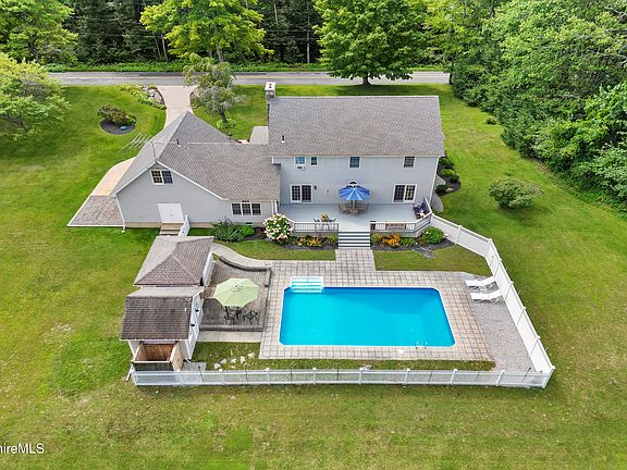 Classic, center hall, colonial style home, boasting 4-bedrooms and 3.5-bathrooms. Located on a spacious 3.18 acre lot, this home is nestled in a peaceful rural setting, offering the tranquility of country living with the convenience of town sewer, close to Ashmere Lake and all Berkshire attractions. Inside discover refinished hardwood floors, adding warmth and elegance throughout. The cozy fireplace is perfect for chilly evenings, while the large front porch invites you to relax and take in the surroundings. The 2-car heated garage, ensures your vehicles stay warm in the winter. A beautiful inground pool complete with a cabana is ideal for summer entertaining. The 2-year-old roof offers peace of mind, and the sheds provide additional storage. A perfect retreat in the heart of nature!!
