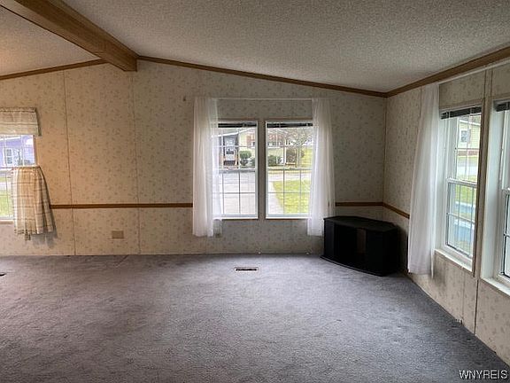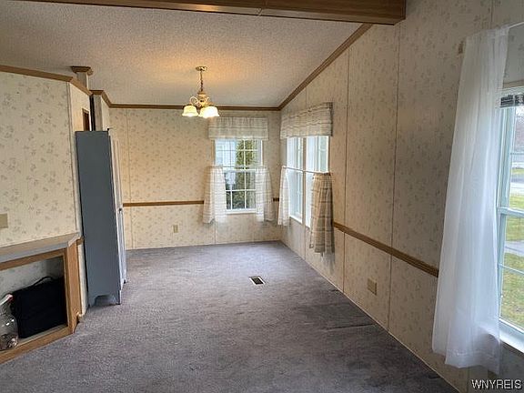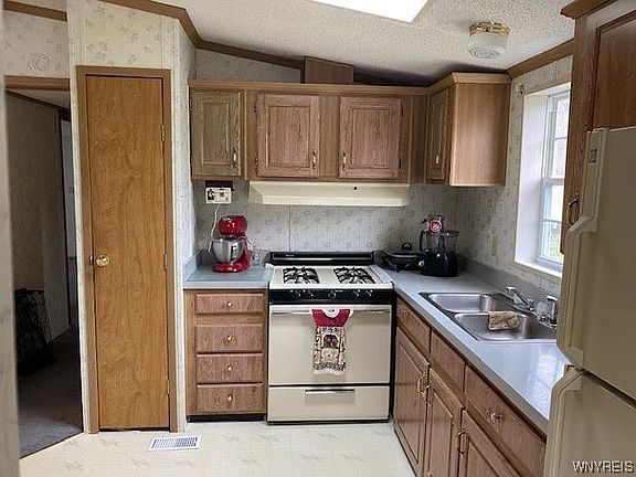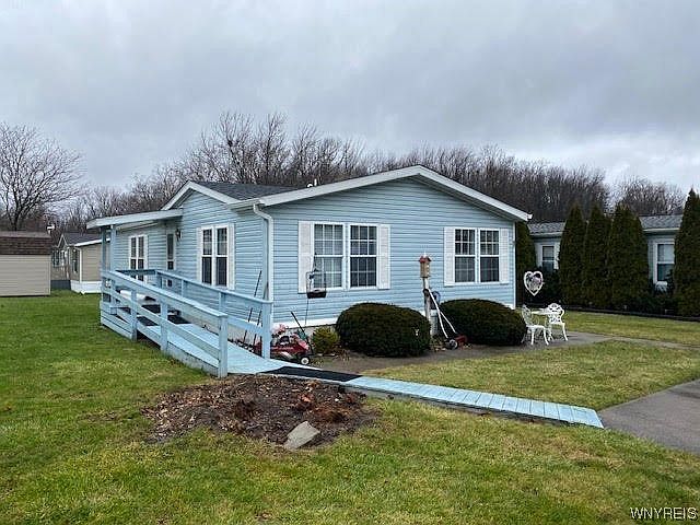 First floor living in this well maintained double wide in Lakewood Village park in Medina NY. Home is wheelchair accessible by way of exterior ramp and some doorways. Ample cabinet space in the kitchen, as well as a pantry. Large primary bedroom with en suite and large closets. Living room/dining room combination, and there is enough room in the kitchen for informal dining. Double wide driveway, central A/C and shed.