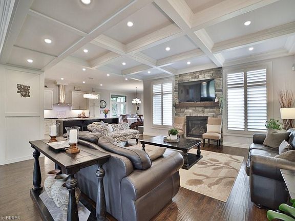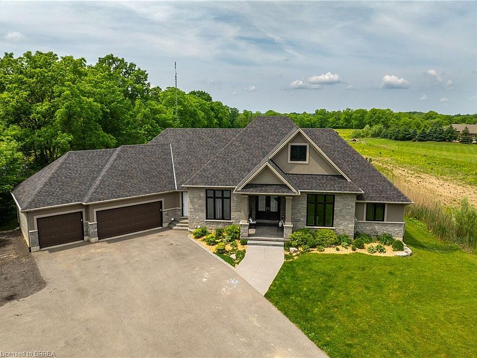 Welcome to this stunning 9 year old executive bungalow nestled on a beautiful 1.12 acre lot backing onto farm fields, and siding on a treed lot. This spacious home boasts almost 5000 sq ft of finished modern elegance and thoughtful design. Step inside to discover 10' coffered ceilings that create an airy atmosphere and enhance the sense of space. Entertain with ease in the open-space kitchen, living, and dining areas where large windows flood the space with natural light and picturesque views of the lush and peaceful surroundings. The heart of the home is the open kitchen featuring large island with sleek granite countertops that perfectly compliment the stylish cabinets and luxurious appliances. Master Bedroom offers private walk in closet, 5 piece ensuite, and walk-out to covered deck overlooking rear yard and abutting fields. With a 3 car attached garage, there is ample room for both vehicles and storage. Separate entrance to basement leads to 2 bedroom in-law suite with its own kitchen, 4 piece bath and laundry.