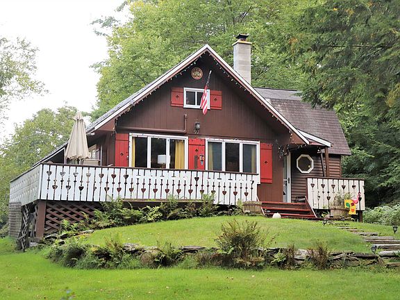 This charming 2-bedroom, 2 bath authentic Tyrolean chalet rests on a private 5.2 acre lot with easy access to Saxton’s River, Westminster West and Putney. Perched on a sunny knoll overlooking lush meadows and leafy forests, the quiet home is currently used as a vacation home and an AirBNB rental but would also make a fine primary home. This abode features bright cathedral-ceiling living room with handsome stone fireplace, offering an efficient wood-burning stove that heats the entire house with ease. The sunny eat-kitchen overooks the spacious level rear yard teeming with deer and wildlife while providing you plenty of room to play or plant a garden. Upstairs is a nice loft area to read a book, set up a home office, or provide additional space for sleeping with a small bed or pull out couch. The primary en-suite bedroom is off the loft and has its own 1/2 bath. Internet is provided by speedy fiber optics. The newer septic system will provide decades of worry free service. Newer mini-split provides energy efficient heat and air conditioning. Must be seen to be appreciated-make an appointment to tour this unique property today! Please no Drivebys as their are frequent guests at the house and showing schedules are limited to times when there are no guests.