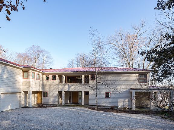 With soaring and dramatic water views from every room, this architect designed modern home sits above a country road that winds along the edge of a pristine and unspoiled lake. With almost 6000 square feet of luxurious living space on more than 10 acres of privacy, it has all the components of a spectacular country estate. The water frontage offers direct access for fishing, sailing and stand-up paddle boarding. (Large motors are not permitted on the lake.) The 2 story atrium offers enhanced lake views through the living and dining rooms. The cooks kitchen is part of a beautifully appointed family room and opens to a large deck with stunning lake views. There is also a connected covered stone patio perfect for grilling. There are 5 bedrooms, each with it's own bath including a master suite with his and her closets, whirlpool bath and separate shower all oriented toward the water view. There are also 2 offices and a large laundry room on the second floor. The closets in the house are cedar lined and there are many built in features. The 2 car garage is attached and offers enough space for storing your sporting equipment as well. The paneled library is complete with fireplace and a glass wall overlooking the lake. This home is the perfect place to unwind.