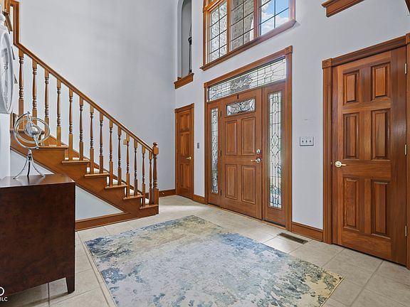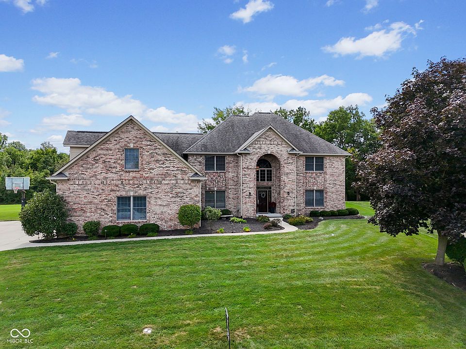 This exquisite custom residence located in Brownsburg's Holloway Ridge boasts five bedrooms and four and a half bathrooms. The main-floor primary suite comprises a fireplace and an expansive walk-in closet. The property features a large living room and a second-floor family room, both equipped with gas fireplaces. The latter also comprises a wet bar and a pool table. The spacious kitchen is complemented by a breakfast nook. The home offers multiple patios, including a screened porch with a picturous view of the golf course. The patio is equipped with a hot tub and gas fireplace. The distinctive basement comprises a complete home gym with equipment. The basement recreation room is furnished with a wet bar and projection TV. The basement is finished with a sauna, laundry facilities, and ample storage, all with walk-out access to an outdoor patio.