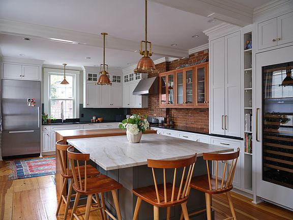 Outstanding, centrally located, 1865 furnished townhome apartment for rent with 9-foot ceilings, exposed brick, crown moldings, custom kitchen and bathrooms, and roof deck. The kitchen features custom, high-end cabinetry with Miele, Subzero and Thermador appliances. Stacked washer and dryer are located on the main living floor. The primary bedroom features a California King bed with a built-in dresser and ample closet space. The guest bedroom has custom closets with a queen size Murphy bed allowing the room to quickly be transformed into a workout space, nursery, or sitting room off the roof deck that faces west for sunsets. There is a 3rd guest room loft area that doubles as an office that features a king size bed. Skylights that are well above any surrounding buildings or trees allow ample light into the loft space on the top floor. This property is filled with natural light as the front has large windows that face east and the back faces west. Brand new heat pumps help keep this property comfortable all year and is assisted by brand new natural gas on demand heat. One parking space included. Lots of private storage available in basement. See Maine Magazine's January 2023 featured article on the property! Standard annual lease terms apply. Open to extending multiyear lease. Furnishings include beds, couch, Samsung Frame TV with Sonos soundbar, coffee tables, counter stools, dining table, sideboard, and leather chairs. Kitchen items such as cookware, dishes, flatware and coffee maker will not be provided. The owners will be removing their artwork, rugs and other personal items. The idea of the arrangement is that given the unique space and vertical nature of the townhome, the tenant does not need to worry about moving in and out heavy and large items. Just boxes with kitchen items, and personal belongings is all you'll need! No pets, however, under specific circumstances we can discuss the possibility. Includes 1 parking space.