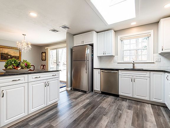 Great home located in the friendly neighborhood of Rolling Meadows, down a private drive to 1.5 acres of lightly wooded surroundings. The slate floored foyer opens to an expansive light-filled living room, dining room and kitchen. From the west facing picture window to the sliding glass doors leading out to a custom designed deck, the open space is perfect for entertaining. A large skylight and window brings light throughout the recently remodeled kitchen which includes granite counter tops, and stainless appliances complete with a breakfast peninsula. A wood fireplace with expansive family room downstairs and a 4th bedroom with half bath/laundry. Large mud room/utility room with walk-out connects to large 2 car garage. Central Air with baseboard heat.Close to schools, downtown, and Metro-North. All new kitchen 2021, all new master bathroom 2021, new roof in 2020, automated house generator. Call today for your showing. No brokers please.