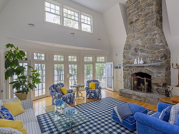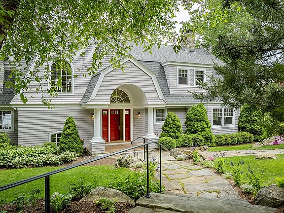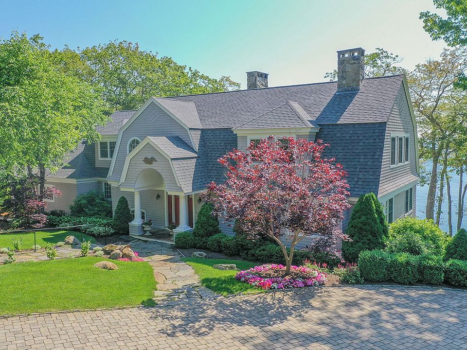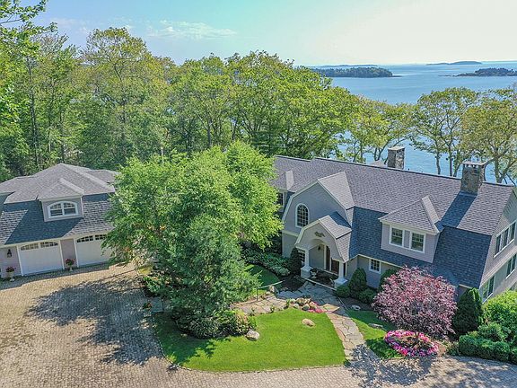 This privately sited waterfront home in Rockport offers spectacular views of Penobscot Bay and Indian Island Lighthouse. The 5.7± acre property is accessed by a winding drive through tranquil woods and the house sits above a hillside that slopes to the water's edge with 255± feet of rocky shorefront. The year-round house was built in 2001 and features bright, open living spaces, four bedrooms, a nicely finished walk-out basement and excellent water views from nearly every room. The well-maintained residence is artfully landscaped with creative stonework, ornamentals, flowering shrubs and perennials; and a detached two-car garage with studio apartment above completes the property.
