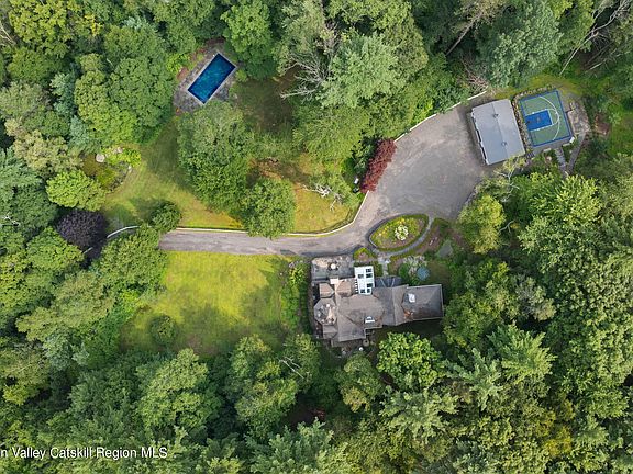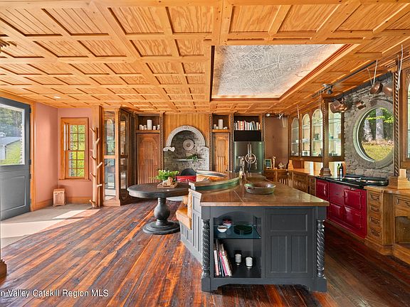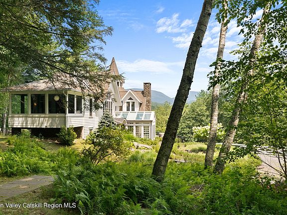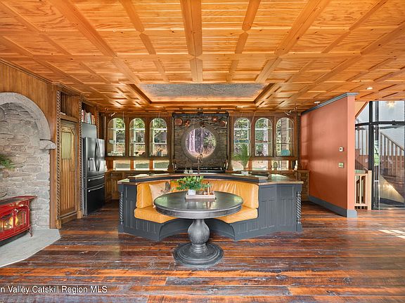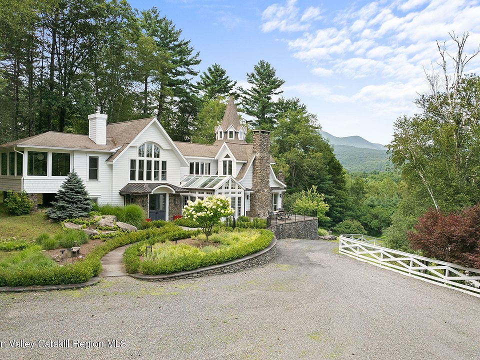Nestled atop a sprawling 14-acre estate, this architectural showcase emerges majestically from the woods, evoking the charm of a fairytale castle. Spanning 4,086 sq. ft., this one-of-a-kind residence offers a harmonious blend of luxury and nature. The property features not only a remarkable home with 3 bedrooms and 3 and 1/2 bathrooms but also hosts a two-car garage with office/workshop, inground pool, pond, basketball court and stunning views of the Catskill Mountains.