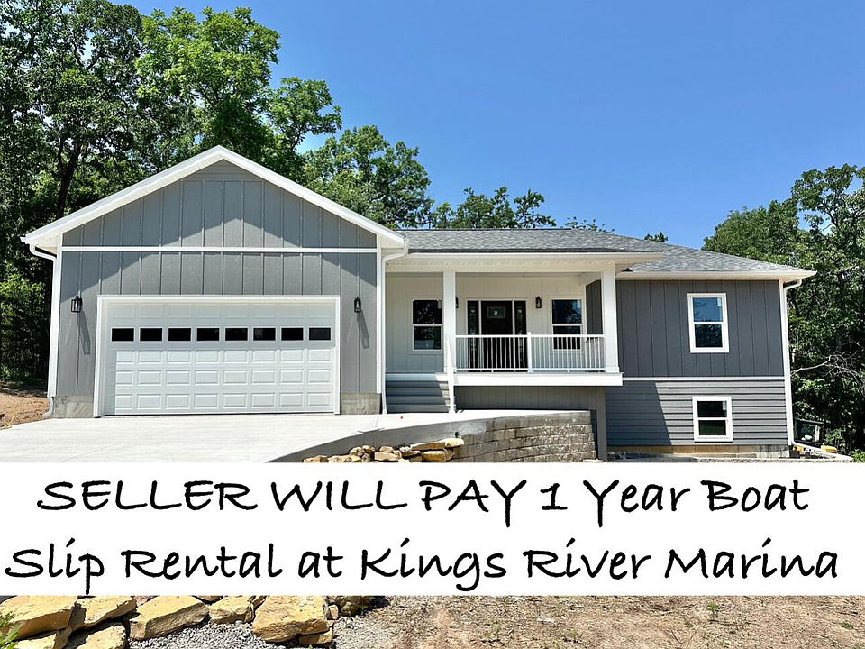 Seller will pay for a 1 YEAR BOAT SLIP RENTAL at Kings River Marina that is 7 Minutes from the home ! Bring your boat!! *MUST SEE VIRTUAL TOUR !! Step into your dream home on Table Rock Lake with this stunning brand new construction home featuring 5 spacious bedrooms, 3 full bathrooms,2 car garage, well maintained road and thoughtfully designed for modern living. This elegant two-story home offers a perfect blend of style, space, and functionality that's ideal for growing families or those who love to entertain. On the main floor, enjoy a open concept layout that boasts a bright living area with 9 foot ceilings, walk out back deck to sit and enjoy your peaceful evenings, a chefs dream kitchen with a large island perfect for gatherings. The main floor has two generously sized bedrooms with large closets, and a full bath between the two rooms. Also on the main floor is your primary suite with a walk-in closet and a luxurious primary bath complete with a walk-in shower and stunning finishes. The finished basement offers a fully concrete storm shelter room, spacious laundry/utility room, full size living area, a full kitchen with breathtaking black granite countertops and fixtures, dining area, two bedrooms, another full bathroom AND walk out access to your back porch and yard! This home sits on a impressive 3 lots. There is room to build a shop for your boats or vehicles. The possibilities are endless! Being brand new, you as a homeowner will not have to worry about any problems! Move in and start enjoying the lake life! Public boat launch is ONLY 4 minutes away on all blacktop road for all the lake lovers! There is also a few places to rent a boat slip (more information available) ! With MANY amenities such as restaurants, dogwood canyon, Kimberling City, Branson, wonderful Shell Knob school district, top notch medical nearby, and of course, the lake! The home also features a LP backup system for heating and air, ensuring comfort year-round even during power outages
