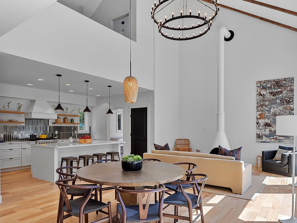 Nestled on over 2 acres of serene Becket countryside, this inviting home beckons with its tranquil setting on a quiet country road. Step into a world of comfort and elegance as you discover a beautifully designed sanctuary boasting tall, vaulted ceilings adorned with antique beams, a stunning MALM mid-century fireplace, and hickory wood flooring throughout.