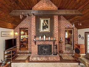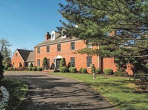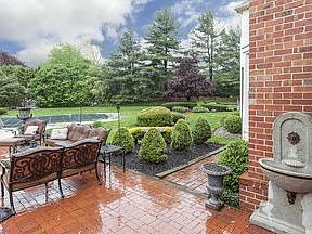 A luxuriantly landscaped lot, warm-hued brick exterior, and rooms attentively finished with thoughtful details are the offerings of this stately Colonial in Elm Ridge Park. The two-story entry, with wainscoting, ceiling medallion, and marble floor, introduces the living room with raised hearth corner fireplace, dentil molding and gleaming wood floor. The formal dining room has crown molding, ceiling medallion, and wainscoting. A beamed cathedral wood ceiling and brick fireplace bring a welcoming ambiance to the striking family room. French doors lead to a lovely brick patio and pool, surrounded by trees and flower gardens. A separate entrance leads to secluded guest room and skylit bath. The beautifully remodeled kitchen, with Corian and granite countertops, center island, and breakfast bar, has a sunny eat-in area. A hallway leads to an office, powder room and laundry/mud room. Upstairs, find the master bedroom with fireplace and luxurious bath, and three additional, spacious bedrooms and a hall bath.