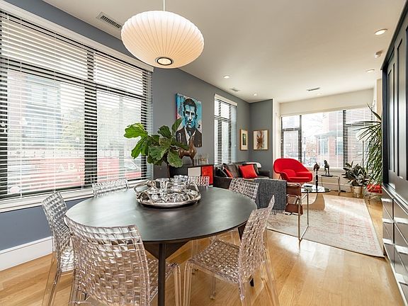 Modern duplex in a Victorian setting. 2 Bedroom + Office, 2.5 Bathrooms. Living area has a bright corner exposure and sleek gas fireplace with oak paneling. Kitchen has walnut cabinets, quartz counters, glass subway tile backsplash, stainless steel appliances and gas cooking on a Bertazzoni range. There's a 1/2 Bath off the Kitchen and next to the Office. The Office has two windows and is the perfect WFH space. The lower level has 2 Bedrooms, laundry, utility and storage closets. The Primary en suite bedroom has a walk in closet, bathroom with soaking tub and walk in shower and french doors to an exclusive use brick patio. Guest Bath is off the main hall next to the Guest Bedroom. Recessed lighting and white oak hardwood floors throughout. Central a/c and in unit laundry.