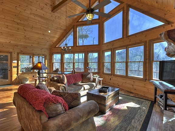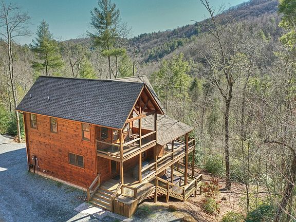 "Falls Branch Lodge" is a Successful Vacation Rental inside a Gated 5-Lot Community bordering 28,500 National Forest Acres & Deeded Access to 3 Major Hiking Trails. All Paved Access to this Community thru (Aska's) Stanley Creek OR Cherry Log's Rock Creek off Hwy 515 thru the National Forest Rd. Log Sided/Cedar Shake PROW CHALET w/Screened in "Party Porch"(Wood Burning Fireplace plus Firepit Area) & Plenty of Parking.Spacious "All Wood" Great Rm w/Signature Fireplace & Acacia Frs."Circle Sawed" Custom Kitchen Cabs,Gas Stove,GraniteTops, Slate Tile Bksplash & raised thick "Wood Slab" Counterbar. Ceramic Tile in all Baths w/TWO "Full Slate"Showers (HUGE Master Shower w/ Double-Heads/STEAM Spa, All "Copper Sinks" & Custom Shower Doors. Laundry on Main. Private Upper Suite w/Covered Porch/Walk in Closet.Finished Terrace Level w /Bonus Rm & Billiard Area, Stone Fireplace & Charming Wetbar w.thick Wood Slab Bar.Nice Combination of Wood/Textured Drywall, BEAMS & Stone. Beautiful BIG ACREAGE within walking distance of the Waterfalls.