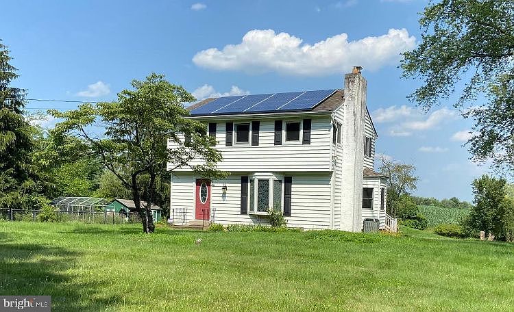 Endless possibilities on 1.85 picturesque acres that overlook open space in Desirable Upper Makefield Township near the intersection of Eagle and Wrightstown Roads. This 3BR home boasts a bright kitchen with quartz counters, glass and stone backsplash, Pergo flooring, solid maple cabinets, under cabinet lighting, Frigidaire convection oven and microwave, Anderson windows and French doors lead to a Trex deck. The layout flows throughout the living area. Beautiful refinished wood flooring, a large bay window and a lovely brick fireplace in large living room. Upstairs are 3 large bedrooms w gleaming wood flooring, European tilt and turn windows, organized closets and solid 6 panel doors. The 2 bathrooms have been remodeled and the basement has been partially refinished with Pergo flooring and has built in shelving, making this the perfect place for additional living space. Workshop and laundry are in a separate area with Bilko door exit to the exterior. Additional features include: Storage shed(AS IS), concrete pad with covering frame, pull down attic stairs, recessed LED lighting in hall, kitchen, and master bedroom, Lutron sensor switches, LED outdoor lights, mature trees Refinished original hardwood. Newer sand mound septic system that welcome expansion of this house. Solar panels installed for Green savings on Electricity. ( Leased)This is a must see!