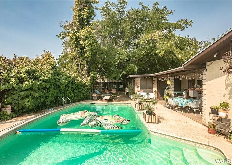 Welcome to your own oasis in the desert! 36x15 ft. in ground gunite pool with a diving board surrounded by mature greenery! This roomy house has 3 bedrooms, 2 bathrooms, a huge Arizona room right off of the master bedroom, a living/dining room and a family room! Plenty of storage throughout the home with large closets, a master dressing area, two hall closets, and a shed! There is even a built in vanity in the dressing room! Your AZ room could be the new home to a jacuzzi, a game room, or a master living room! You can sit in your hanging porch swing on your front porch courtyard and enjoy the grass and mature trees. There is ample parking for all your toys with a large front side yard and gates to the back RV/boat yard area. The AC unit, entire roof, and water heater have all been replaced within the last five years! Sellers are offering a negotiable flooring allowance! Schedule your tour soon, this gorgeous pool home won't last long!