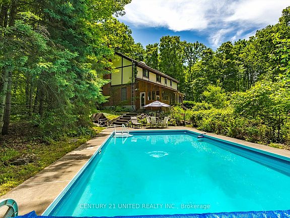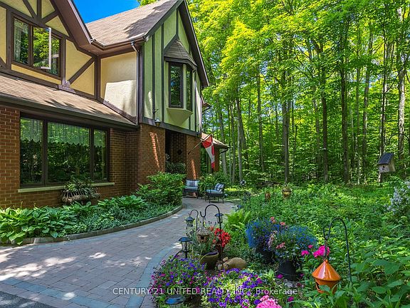 This classic custom-built Tudor-style home in the picturesque Bridgenorth Estates offers a serene and private retreat with its charming 2.82 acre lot. With 3,100 sq ft of living space, the home boasts four spacious bedrooms and three bathrooms, complemented by elegant old-world charm and modern amenities. The property features expansive principal rooms, including a formal dining room, a living room with a cozy wood-burning fireplace, and a family room with a gas stove, heat pump. Additional highlights include a sunroom, back porch, main floor laundry, and a grand foyer. Every window offers stunning views of the beautifully landscaped perennial gardens, mature trees, and inground pool. Recent updates enhance the home's appeal: the shingles and eavestrough were replaced in 2015, the hot water heater and gas furnace were upgraded in 2019, and some windows and doors new in 2022. The septic tank and filter bed were also updated in 2021. Located just minutes from Bridgenorth, Peterborough, and Lakefield, with easy access to Highway 115 and only 20 minutes from Peterborough Regional Health Centre, this pre-inspected home combines comfort, functionality, and timeless elegance. Set in an area of upscale custom-built homes, it offers both a tranquil setting and convenient access to local amenities.