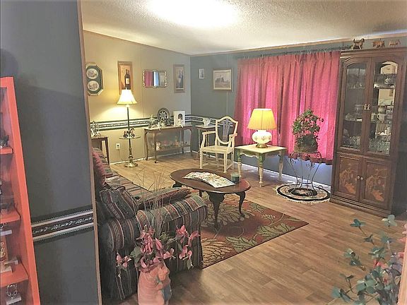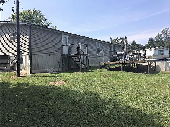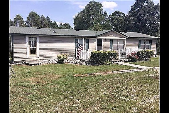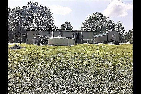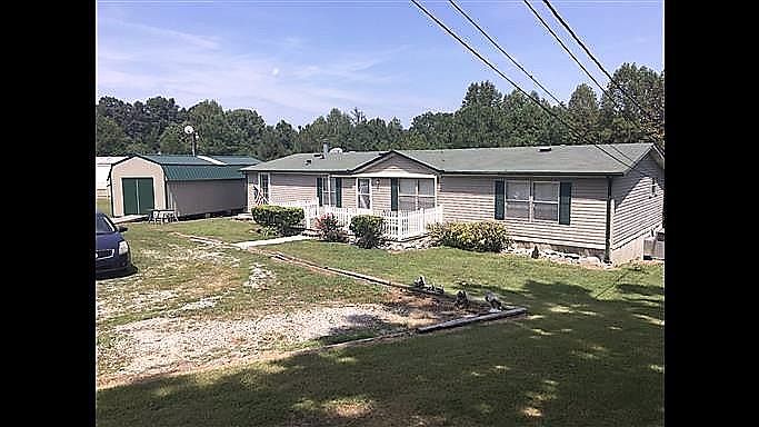Double-wide manufactured home with 3 bedrooms, 2 baths, formal dining room, living room, den, utility room, and fireplace, with storage building in front.
