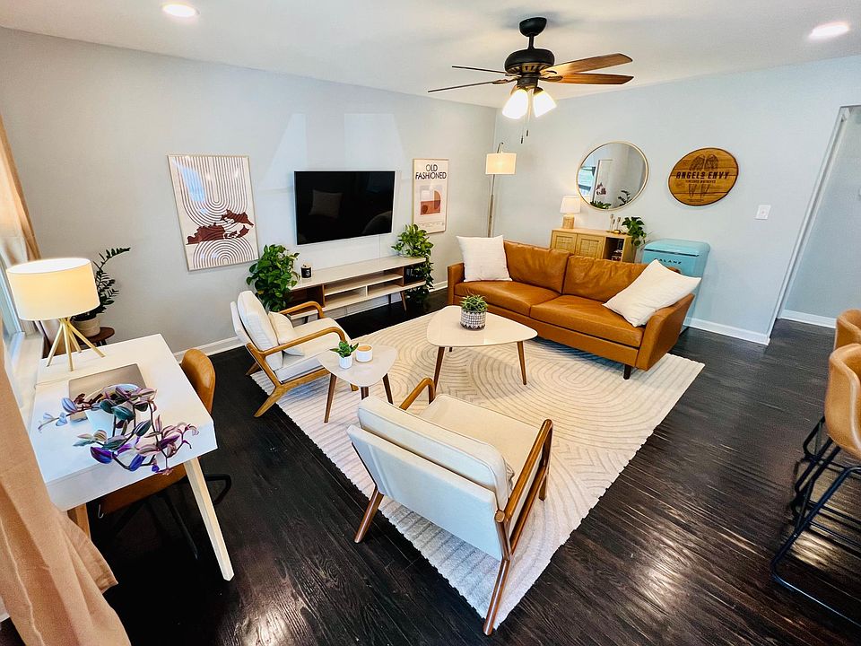Fully furnished, utilities included. Walking distance to Highlands, Germantown, and Paristown shops, bars, and restaurants. Half-mile from Cherokee Triangle/O'Shea's Bar area. One mile from Nulu and downtown! Newly remodeled two bedroom one bathroom apartment with open floor plan and lots of natural light, front porch, fenced in yard, and personal driveway! Washer and dryer are included in unit. Kitchen features include tile floor and backsplash, quarts countertops, island with bar overhang, refrigerator, dishwasher, microwave, and range. Living room includes all furniture, decor, and mounted smart TV pictured. Bathroom features include vanity, toilet, tile floor and shower surround with large rainfall shower head. Bedroom 1 includes one queen bed, two nightstands, dresser, large mirror, lamps, and mounted smart TV. Bedroom 2 includes pull down full size murphy bed and desk with office chair. Entry door is keyless and keypad can be programmed to desired code. Let me know if you have any questions or would like to schedule a visit! Fully furnished, utilities included! 3, 6, or 12 month lease available. Landlord upkeeps property and lawn-care maintenance.
