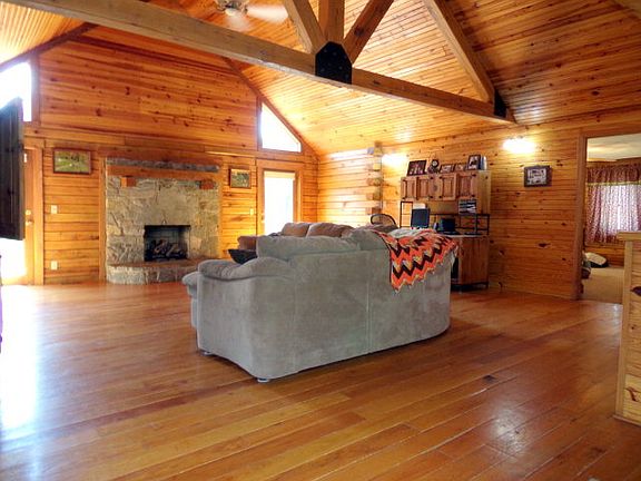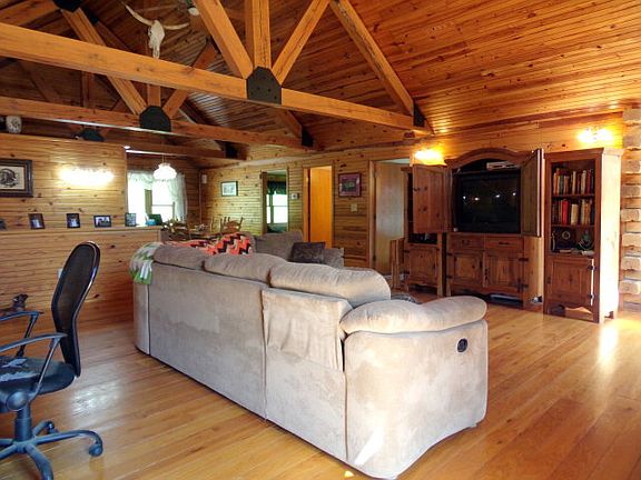 Beautiful log home situated on over 12 acres! This 3 bedroom 2.5 bath home features a stone fireplace with gas logs in the living room. Access the large front porch from the living room or the master bedroom and enjoy the view. The walkout basement has a 2.5 car garage, rec room with woodburning fireplace, and family room which could be used as a 4th bedroom. Also features a 28 x 32 pole barn.