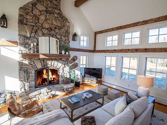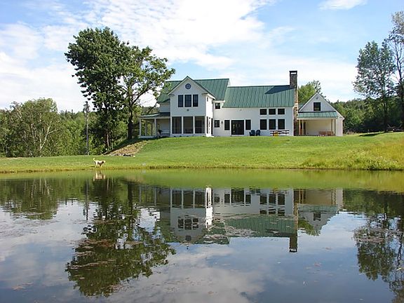 Quintessential, four-bedroom Vermont farmhouse on more than 54 acres with a combination of open, gently sloping and wooded acreage. Tastefully updated and restored with integrity. Enjoy the beautiful, private setting with a pretty ridge view, overlooking the pond, yet minutes to Okemo and village amenities. Large country kitchen with breakfast bar includes cottage cabinetry, stone counter tops, new stainless steel appliances, and original maple floors. Open kitchen/dining/living design highlighted by a floor-to-ceiling stone fireplace, exposed period timbers, wood floors and cathedral ceiling. Main level bedroom is accented by wide board floors and an adjoining office space. Primary bedroom suite includes bath with stone counter top, wainscoting and oversized glass-enclosed shower. Two additional bedroom suites include exposed period beams, cathedral ceilings and loft area. Large separate family room offers additional entertainment spaces. Attached one-car garage leads into a customized mudroom with numerous built-ins. Exceptional outside spaces feature a covered porch with hot tub, screened-in porch off the kitchen overlooking the spring fed pond with irrigation system and a delightful sledding hill. Energy-saving features include electric car charging station in the garage, solar panels and spray foam insulation. An exceptional property.