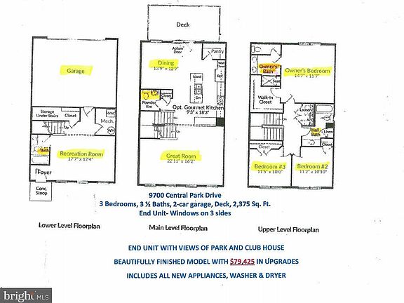 Model home with meticulously appointed interiors and $79,425 in upgrades in the desirable Parkside community! The Odessa by Stanley Martin Homes. There are 3 bedrooms, 3 1/2 baths, 2 car garage, and a deck to enjoy every day. This 2,400 sq. ft. end unit has large windows on three side allowing the natural light to fill the entire home. The airy open floor plan sits on the best lot with views of the park and club house. Recessed lighting and Smartcom system. This home is gorgeous and ready for you to bring your personal taste and style. Ground level features hardwood flooring, a rec room, full bathroom and storage, with access to enclosed 2-car garage. Hardwood stairs to both levels. Upper-level features 9 ft. ceilings. The kitchen is a chef's paradise with a huge island for group seating, quartz countertops, walk in pantry, high-end stainless-steel appliances and ceramic backsplash. Top of the line kitchen cabinets and hardware. Living room/dining room combo with slider to spacious deck and a powder room. Third level three bedrooms and two bathrooms. Luxury owner suite with walk in closet and attached spa bath with dual quartz vanity and extraordinary finishes. Coveted bedroom level laundry. Resort style amenities include a pool, club house, walking paths, tennis courts, fitness center and more! Easy access to the Beltway, Washington DC, National Harbor, and Branch Ave. Metro. Shopping, dining and entertainment nearby. This home has it all. Must see!