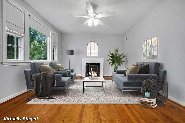 Square Footage: approx. 1714 sq ft, Living room with [fireplace / large windows / hardwood floors], Big backyard, screen porched patio, drive way for 2 cars, Laundry: in unit washer & dryer