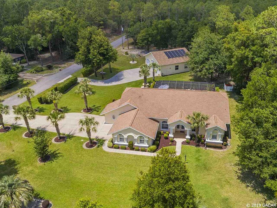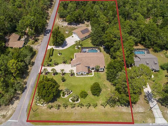 Absolutely immaculate open plan pool home with soaring ceilings situated on 1.08 acres featuring 3 spacious bedrooms and 3 full baths with an additional separate 1,600 sq ft, three bay garage with auto lift for the car enthusiast. Hand scraped Honey Oak flooring throughout with large ceramic tile in all wet areas of this beautifully laid out home. Gorgeous eat-in kitchen with island centered under a skylight and wood cabinets which yield beautiful granite countertops, Stainless Steel appliances including washer and dryer in the laundry room just off the kitchen. Master suite features vaulted ceilings and large walk in closets. The large en suite bath with roman style walk in shower and elevated Roman soaking tub offers columns and beautiful tile surround. Large sliding doors open the living room to your screened pool and lanai area for that real Florida living experience. Rainbow River Community Park and Community Clubhouse offers homeowners the perfect opportunity to explore nature at it's finest while offering activities, gym, gaming room and restaurant along with meeting rooms and green spaces to relax in and enjoy. 24 hr security. The interior design and thoughtful unique touches both inside and out make this home a must see!