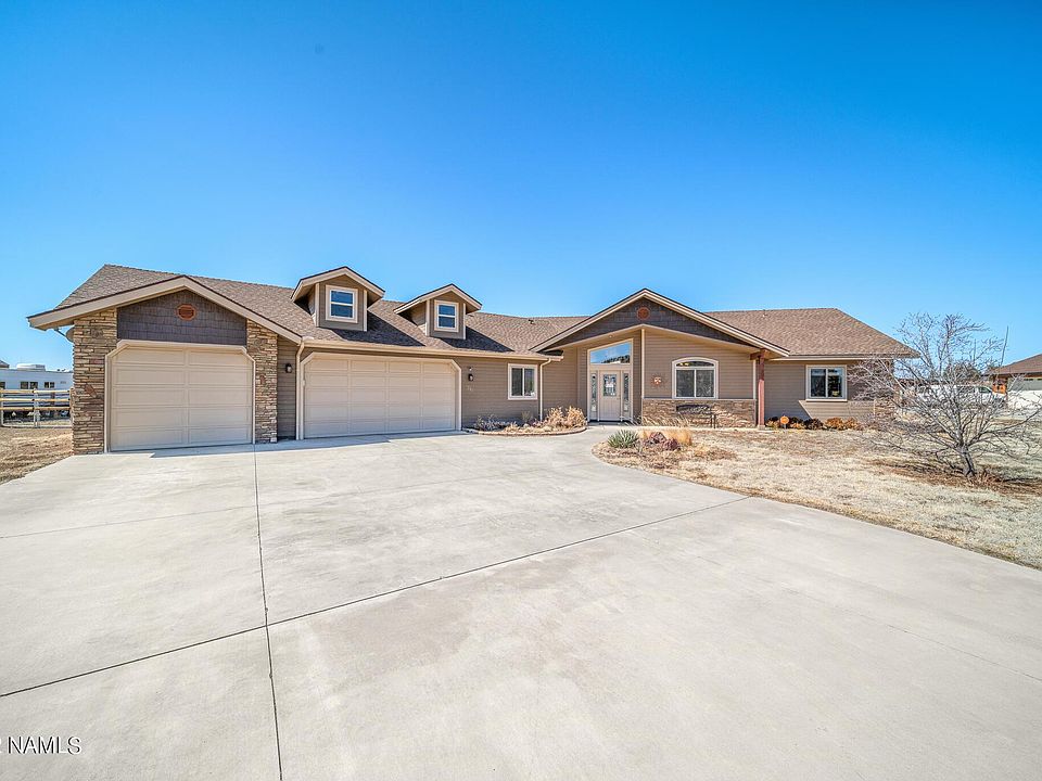 Amazing, gorgeous, turn-key SINGLE LEVEL home on 2.25 acres! 3 bdrms, 2 baths, and HUGE oversized 3 car garage. Incredible view of the Peaks! Newly constructed dog fence within the acreage. Open concept living space with split floor plan. Covered patio facing the peaks. Paved roads all the way to this treasure in the country. See it soon before it's gone!