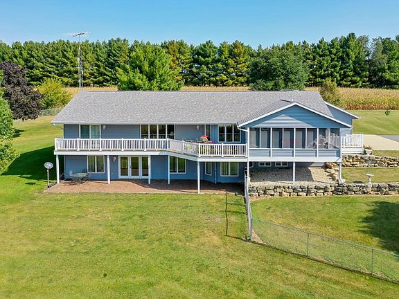 EXCEPTIONAL COUNTRY ESTATE on 7.5 ACRES with 4 WELL-EQUIPED OUTBUILDINGS, TILLABLE LAND & UNMATCHED VIEWS. The spacious 3 bedroom, 3.5 bath RANCH HOME with walk-out lower level offers beautiful wood flooring throughout, cental vac system indoors & irrigation system outdoors. You find spectacular views from every room in the house including the generous primary suite with access to the wrap-around deck leading to the screened in porch. Finished lower level has autonomous living quarters with full kitchen, full bath, bedroom & roomy living room area. The 4 unique outbuildings offer various iterations of electric, heat, water & access. This unique property has a tornado shelter, 3 wells, one that services the home; the other 2 provide water to the grounds & outbuildings. This is a MUST SEE!