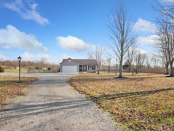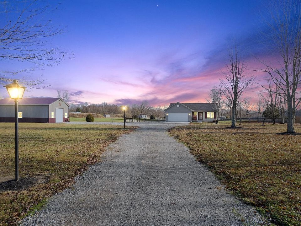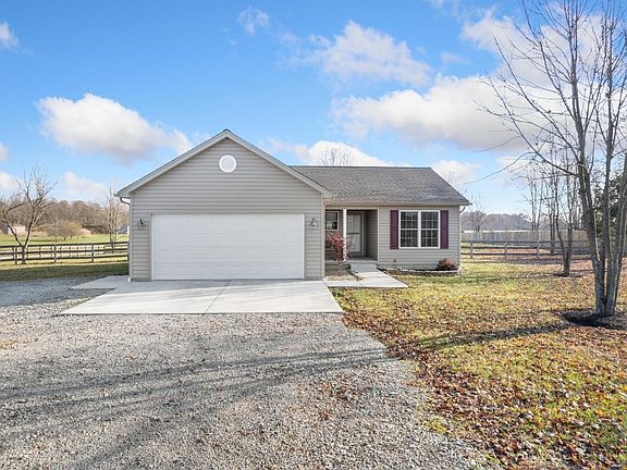 Beautiful 3 bedroom + 2 full bath custom ranch home w/ 2 car attached garage. Open floor plan. Charming kitchen w/ black stainless steel appliances. Walkout to relax on a 10 x 22 deck w/ a spacious fenced in back yard. Large 30 x 40 pole barn w/ concrete floor & pull thru access. Privacy & country living on 5+ acres. Built in 2019.