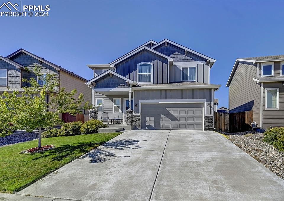 Welcome to this beautiful 3-bedroom, 2.5-bathroom home in the sought-after Lorson Ranch community! This property features an oversized master bedroom with an attached bath, a walk-in closet, and plenty of space to unwind. The expansive lot offers a fully fenced backyard, perfect for outdoor activities and privacy. The heart of the home is the modern kitchen, complete with a central island, stainless steel appliances, and a convenient pantry. Tasteful accent walls add a touch of elegance, while the second-floor laundry room provides added convenience. Enjoy the comfort of central air and the practicality of a two-car garage. Step outside to a quaint front porch and mature landscaping that enhance the curb appeal. Located just minutes from Fort Carson and Peterson Space Force Base, this home combines comfort, style, and a prime location. It’s a must-see!