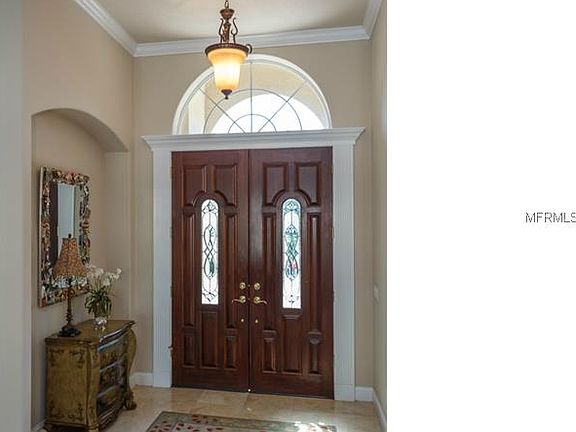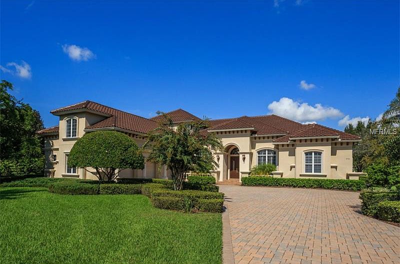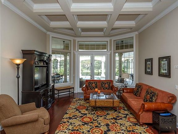 Keene's Pointe, gated/attended golf community. This gorgeous four bedroom custom home is located on a stunning, oversized lot overlooking a pond and the 18th green of The Golden Bear Club. Features custom details throughout including crown moldings, travertine and hardwood flooring, plantation shutters, trey and coffered ceilings, and much more. Each room is canvassed with natural lighting and an abundance of windows. The first floor includes the formal living and dining rooms, an office, and a guest suite with its own bath. The kitchen offers commercial grade appliances and opens up to the breakfast room and family room that features built-in cabinetry, a gas fireplace and wet bar. The master suite has dual closets, a spacious bath and scenic views of the lanai, pool and the 18th fairway. The second floor offers two additional bedrooms with a Jack-and-Jill bath and a huge bonus/game room with wetbar. Enjoy year-round entertaining on the covered/screened lanai with an additional wetbar. Spacious laundry and three-car garage are an added bonus! New AC units, carpeting, wood flooring, water treatment system, pool heater, and landscape lighting are just a few of the updates in the well-maintained home.