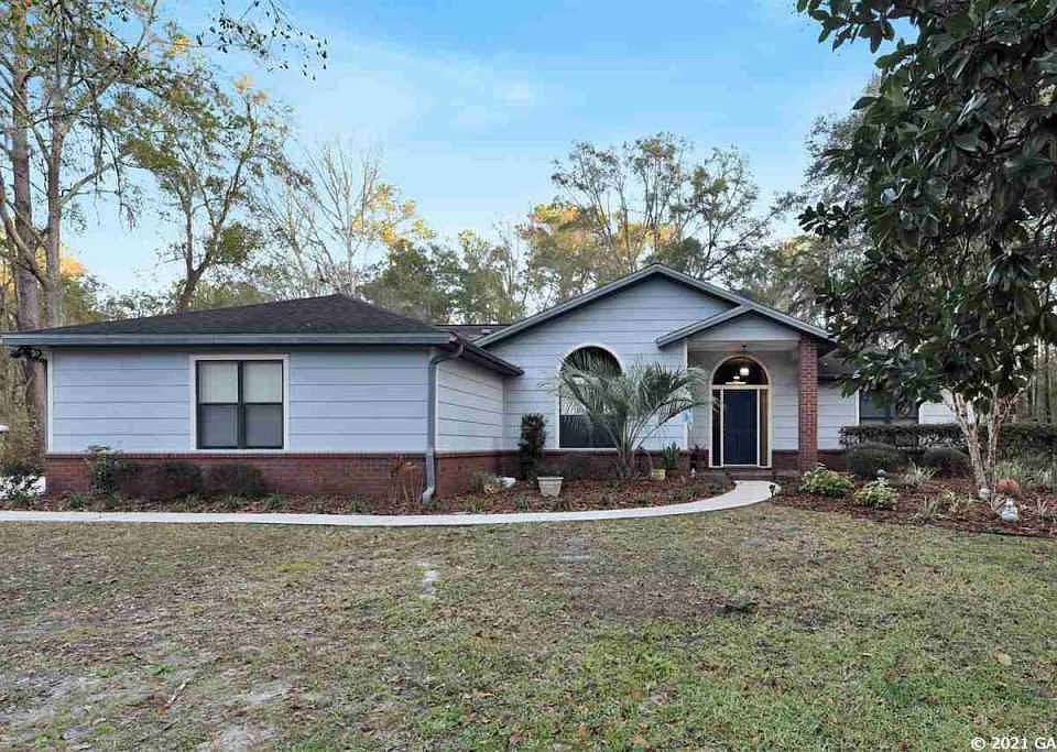 Situated off of NW 91st St just north of Haile Plantation, enjoy the prime location of living in Shafto Meadows! With 1.5 acres and 1,900+ SqFt of space, this 3 bed/2 bath has plenty of space for you and your family. The stunning kitchen features granite counters, new appliances and cabinets, recessed lighting, and open views of the living and dining spaces. A dining nook connects the kitchen to the family room, where you can gather on chilly evenings in front of the wood-burning fireplace. Just off the kitchen, a large flex space offers room for your home office, home gym, or even a formal dining room. Vaulted ceilings and beautiful wood-like tile create a warm welcome to the master suite, complete with a large separate tub and dual sink vanity. The remaining two spacious bedrooms share the second bathroom, which offers a tub/shower combo perfect for your kids and pets. Speaking of which, this massive lot is fully fenced-in, providing a secure space for your kids and pets to play. In addition to the 2-car garage, a storage shed in the backyard can easily house all of your lawn care and outdoor recreation items. Meanwhile, the screened-in lanai has plenty of room to add a pool down the road. This suburban oasis could be yours!