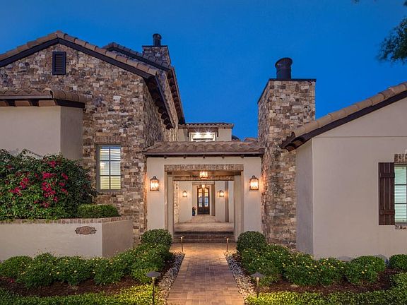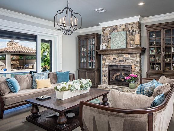 With its sprawling elevation, natural stone facade and lush, floral landscaping, this modern Tuscan estate is enchanting from the moment you see it. Beautiful hardwood floors blend perfectly with the stone lining the arched entryways, where the open interior spans more than 6,400 square feet. Comprised of the formal living room, kitchen and family room, the main gathering area opens to the outdoor living area for seamless indoor-outdoor living. The kitchen boasts an expansive island, professional stainless steel appliances and a charming breakfast nook overlooking the family room, lanai and sparkling pool. With an elegant butler's pantry, the formal dining room offers an intimate space for entertaining family and friends. Generous bedrooms include an exquisite master suite, a detached guest suite and 3 additional bedrooms. The expansive bonus room offers two private balconies - one overlooking the fenced garden and the other overlooking the private motor court. The stunning grounds offer the very best in Florida living, with a custom freeform swimming pool surrounded by a sprawling terrace dotted with palm trees and tropical landscaping. Multiple covered areas including the main lanai with summer kitchen and a detached cabana with stone fireplace offering the perfect venue to escape and relax. Distant views offer a beautiful panorama of the surrounding area, with a sparkling pond and Lake Down as the backdrop.