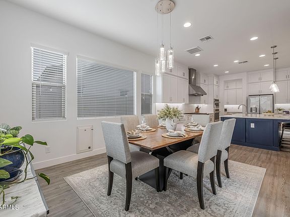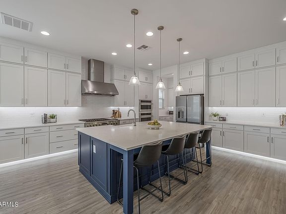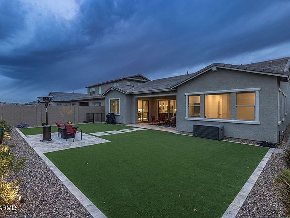 Welcome to this exquisite home boasting gorgeous curb appeal in the highly sought-after Eastmark community. As you step inside, you'll be greeted by luxurious LVP flooring complemented by 5-inch baseboards, creating a stylish and modern ambiance throughout. The home offers ample storage space, ensuring organization and functionality for everyday living. Prepare to be amazed by the jaw-dropping chef's kitchen, featuring white shaker cabinets extending to the ceiling, two-toned cabinets with an island accent, soft-close drawers and cabinets, pull-out pots and pans drawer, and under-cabinet lighting. The massive island with pendant lights and a beverage fridge in the morning kitchen add both style and convenience. (CLICK TO READ MORE) A farmhouse sink completes the look of this culinary masterpiece. The primary suite is truly a retreat, offering generous proportions and ample natural light. The ensuite bathroom boasts dual vanities, upgraded mirrors and fixtures, and an upgraded tiled-to-ceiling shower with a rainfall shower head, providing a luxurious spa-like experience. One of the bedrooms features its own ensuite bathroom with an updated shower tiled to the ceiling and quartz countertops. The other two bedrooms have direct access to a shared full bathroom. The den, with its double glass door entrance, offers versatility as a home office or additional living space. Outside, the backyard is designed for outdoor enjoyment and entertainment, featuring travertine, artificial turf, and essential utilities such as gas, electrical, and water, already routed to the travertine pad for potential BBQ build-in. Just like a world-class resort, this community offers a luxurious community pool, splash pads, numerous parks spread throughout, the Steadfast farm, the Handlebar Diner, and its very own state-of-the-art clubhouse "The Mark". The Mark hosts events throughout the year and a wide variety of family-friendly games to play. Don't miss the opportunity to make this incredible home yours and experience luxury living at its finest!
