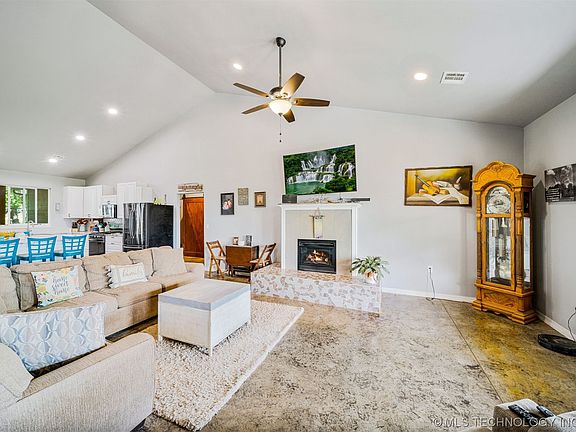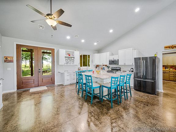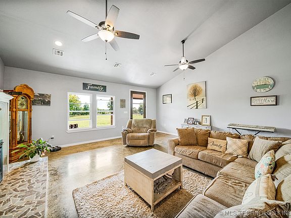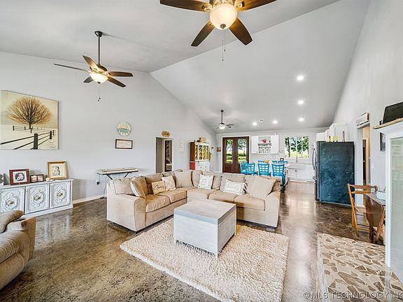 Amazing location: less than 5 minutes to a boat ramp, 12 to Grand Lake, and 15 to Pryor! This custom-built home boasts 3 bedrooms, 2.5 baths, and is filled with farmhouse charm. The open layout with vaulted ceilings effortlessly connects the kitchen, dining area, and living room, creating a space that's perfect for both daily life and entertaining. The kitchen features a beautiful chiseled-edge granite island and a farmhouse sink with upgraded touch faucet. The split floor plan ensures privacy and tranquility, with the master suite on one side and the guest bedrooms on the other. The office nook, large utility room, and enormous pantry give you tons of additional options. Throughout the home you’ll find durable and easy to clean stained concrete floors (even under the carpeted bedroom flooring). You can entertain year-round on the charming 20x14 covered back patio, complete with lights and exposed cedar beams. It's the ideal spot for gatherings, barbecues, or simply savoring the serene views. This home boasts almost 9 acres so you'll have room to roam the open pasture, wooded acreage, or by the pond. This gem also includes a 30x40 metal shop on concrete with electric and two overhead doors for your projects, hobbies, or storage needs - a valuable addition to this already impressive property. This home is a rare find in the highly desirable Adair School District. Don't miss your chance to let this property exceed your expectations!