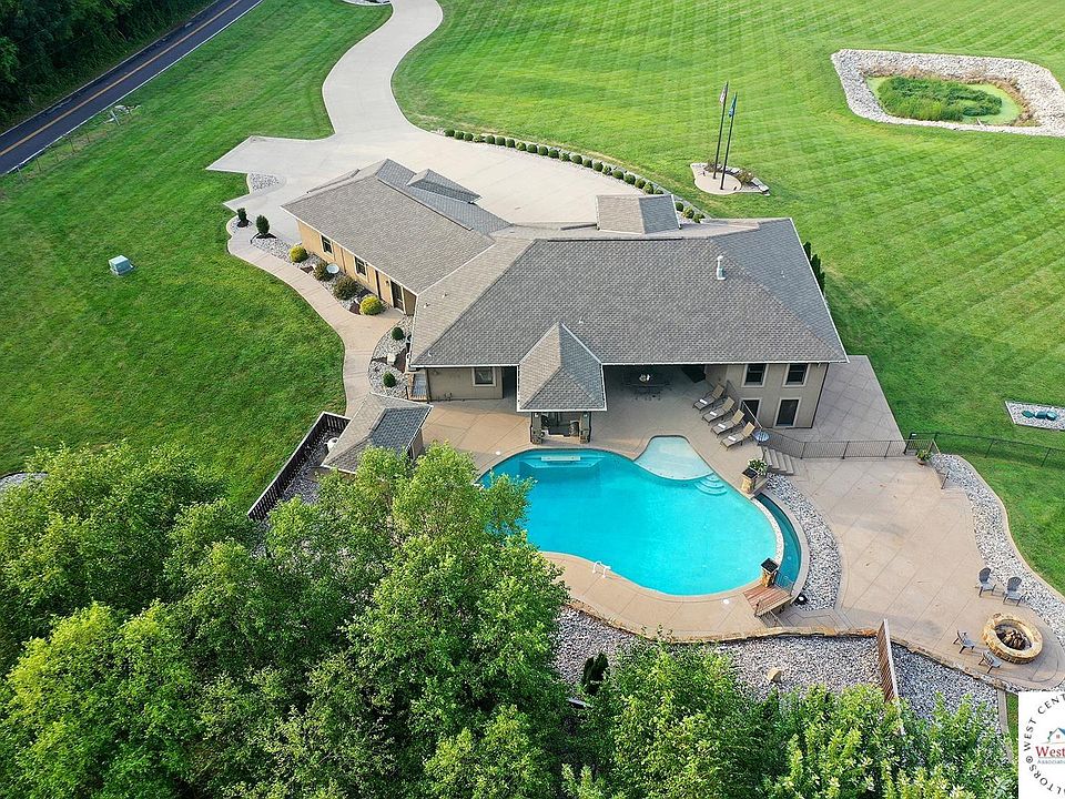 Discover unmatched craftsmanship and outdoor living in this 6-bedroom, 3 full & 2 half bath ranch on 4.3 acres in Lone Jack. Spanning over 4,300 sq ft with a walkout basement, this home blends stunning design with commercial-grade construction—built on solid limestone with 10” thick foundation walls, all true stucco with stone accents, and premium finishes inside and out. Entertain in style with a 63,000-gallon heated saltwater pool featuring a vanishing edge, 10.5' deep end, and swim-up bar. Enjoy the sunken outdoor kitchen with dual LP grills, sink, cooler, gas fire pot accents, a stone fire pit, and expansive multi-tier patios totaling 6,000 sq ft of exposed aggregate. A fenced 1/3-acre enclosure, professional landscaping, and underground-piped half-round gutters complete the exterior perfection. Inside, you’ll find hand-scraped hardwoods, knotty alder cabinetry, quartz countertops, Italian tile, zoned stereo, a security system with cameras, and a hidden safe. The stamped concrete basement with radiant tubing, concrete vault room with reclaimed bank vault door, and secondary storm shelter add peace of mind. A 3-car high ceiling garage with polished floors & workbench, see-through gas fireplace, and electric HVAC & water heaters, including a new 5-ton upper HVAC unit—make this property as functional as it is beautiful. With panoramic views, meticulous attention to detail, and resort-caliber amenities, this is more than a home—it’s a private retreat. Centrally located where Lee's Summit/Lotowana, Blue Springs, Grain Valley & Lone Jack intersect, this home is a gorgeous country sanctuary with suburban convenience and easy highway & metro access.