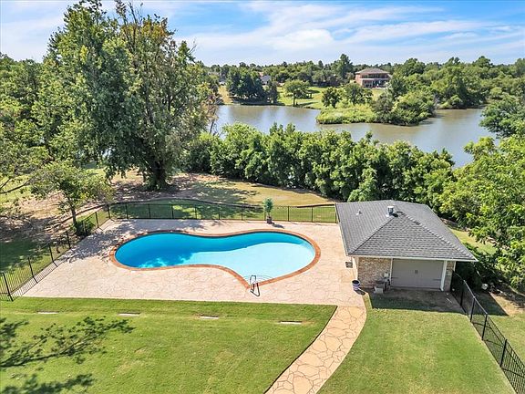 Welcome to a rare opportunity to own a piece of paradise in the spring fed lake of Regal Lake Estates addition, home to only 26 residences with no "through" streets. This exceptional property sits on nearly 1.5 acres, offering serene views of the lake and a private, resort-like backyard with a large backyard patio and newly refinished pool. Step inside to be greeted by wood flooring that flows through the living areas and hallway. The living room features a striking stacked rock fireplace flanked by built-in shelves with matching rock accents. This home offers a second living area that could easily serve as a spacious formal dining room. The kitchen sports granite countertops, a pantry, and an eat-in area. The spacious and private primary bedroom, located at the back of the home, provides a stunning view of the acreage, pool, and lake. The walk-in closet includes deep built-in shelving and convenient pull-down rails. This multi-generational home is a true mother-in-law plan. The second primary suite on the opposite side of the home is fully handicap accessible, featuring wide doors, a barn door into the bathroom, a large walk-in shower, and a ramp in the kitchen that can stay or the seller will remove. The backyard oasis begins with a large concrete patio and stone walkway from the home to the pool. The 10-foot-deep pool has been completely re-plastered with the highest quality finish and is heated by a gas pool heater. The pool house is a one-car garage with a sink, toilet, and storage, and opens to a covered patio, perfect for cookouts and enjoying a view of the lake. A secondary pump for the pool sweep makes pool maintenance a breeze. There is also a three-car garage with insulated doors and a walk-in safe room/storm shelter, a tankless water heater, a whole-house water softener, and plantation shutters. A separate HVAC system for the patio room, an aerobic septic with a 1000-gallon tank add to comfort and functionality. Swim, fish & relax on your private oasis!