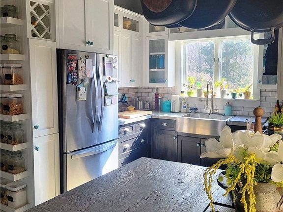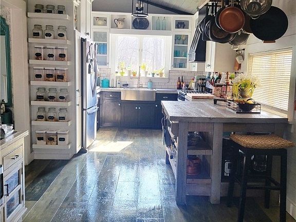 This unique country home has been lovingly restored from the studs to the rafters including all new dry wall, insulation, plumbing and electric. It features eat-in country kitchen with subway tile backsplash, hand crafted cupboards and wood floor, tongue and groove ceiling, stainless steel farmhouse sink; combo dining/living room with original exposed beams, bay window, and wood-burning stove; 17 x 9 sunroom with patio door to the backyard, multi-level deck, fire pit, above-ground pool, and pond; outbuildings include workshop, greenhouse, wood shed and detached garage; five-year-old furnace is central air ready, just needs a condenser. Country living at its finest.