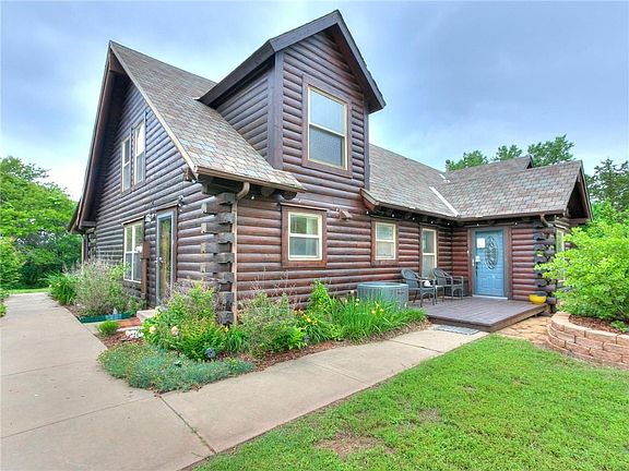Looking for a little bit country but close to it all? This spacious 3000+ sqft log home is it! A well-constructed home situated on 1.5 acres between Edmond & Guthrie. First floor features kitchen with stone countertops/hardwood cabinets, two dining areas, half bath, family area, central fireplace & master suite with spacious walk-in closet, bath with double vanities, jetted tub, & walk-in shower. Second floor has two large bedrooms, full bath, & spacious vaulted loft. Added features include cathedral ceilings, granite top vanities, and Pella windows with blind inserts! The outside features a full-length porch, 3-stall garage with overhead storage, shed/green house, lawn irrigation & aerobic septic systems. Recent updates include gas ceramic log fireplace, upgraded HVAC units, water heaters, & septic aerator. Edmond School District, Logan County taxes, private well water and rural water. Association dues for road only. Buyer to verify all info. Check Google Earth for live pics.