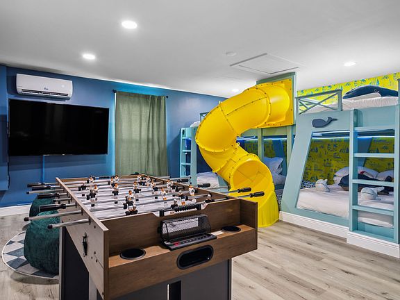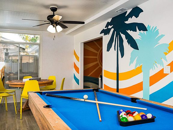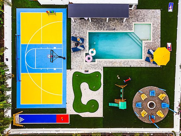 This intimate space features 5 spacious bedrooms with fun and unique designs, 3 modern bathrooms, and a billiard lounge/sun-room. Enjoy the private saltwater pool with an option to add heat, a beautiful chef's kitchen with modern appliances, and indoor and outdoor dining areas. The huge backyard is a game paradise with bowling, a fire pit, and more. Outdoor pool loungers, games, a putting green, a fire pit area, and a private multi-sports court complete the experience.