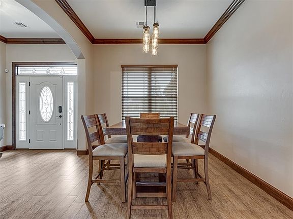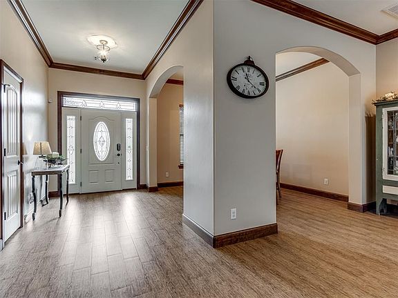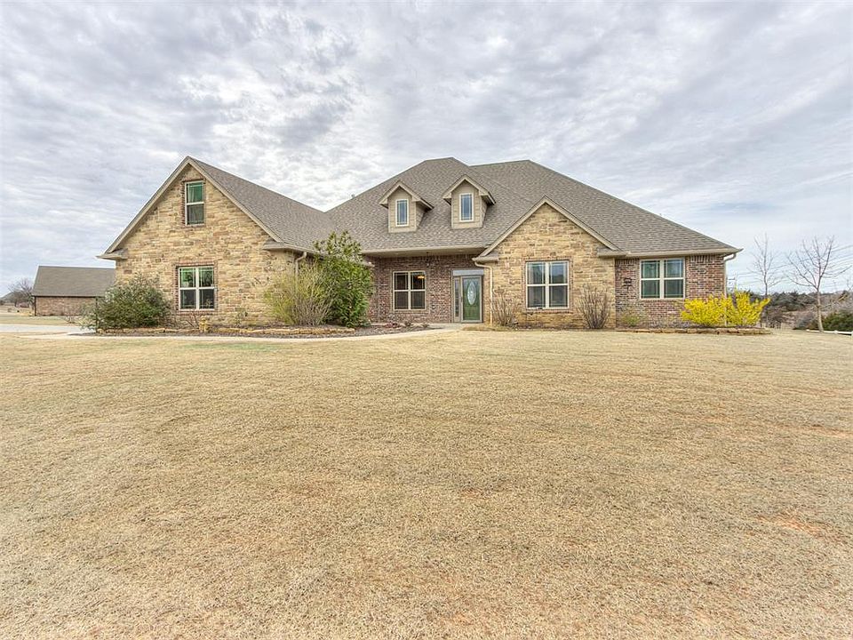 Welcome to your stunning oasis in Choctaw, OK! Situated on just under an acre lot, this stunning 4-bed, 3.1-bath home offers ample space & luxurious features throughout. This house has 4 zones for heat & air & has foam insulation, including the attic. Wired with ADT security system. The 3-car garage is oversized & has been extended to fit larger vehicles. It also has an extra thick concrete pad to support an aboveground storm shelter. The extra building on the South side is fully insulated on the East side, has a ceiling fan with lights, while the West side has a light, concrete ramp, & ample storage for a riding mower & all outdoor lawn & garden needs. The living room boasts a cozy fireplace adorned with beautiful custom printed tile work & built-in wooden bookshelves, creating a warm & inviting atmosphere. The 55” Samsung mounted HDTV with Yamaha receiver & 7.1 digital surround sound system will stay with the home. Double doors lead to a covered back patio overlooking the expansive backyard. The porch includes a plumbed gas line for future addition of outdoor kitchen/fireplace, if desired. The backyard includes a separate fenced area for extended pet run. The kitchen is the true heart of this home, featuring granite countertops, stainless steel appliances, including a refrigerator, double ovens, dishwasher, an island that brings a splash of color, & a brick fireplace. The pantry includes a fully customizable Container Store Elfa pantry system. The spacious primary bed has an en suite primary bath that boasts a double vanity, self-cleaning air jet tub, walk-in shower & additional built-in vanity. The bonus room includes plumbing for a future powder bath to be added. The in-law suite comes complete with a full bath & kitchen area with granite countertops & a fridge. This gorgeous home offers elegance, comfort, & convenience. Don't miss out on the opportunity to make this home your own!