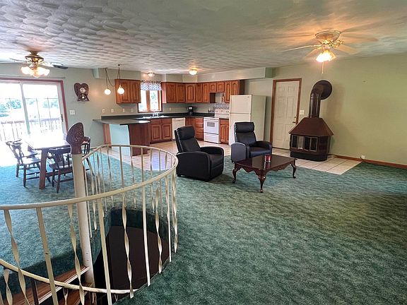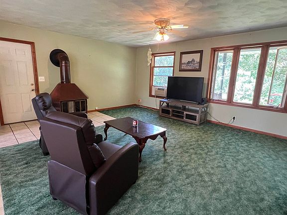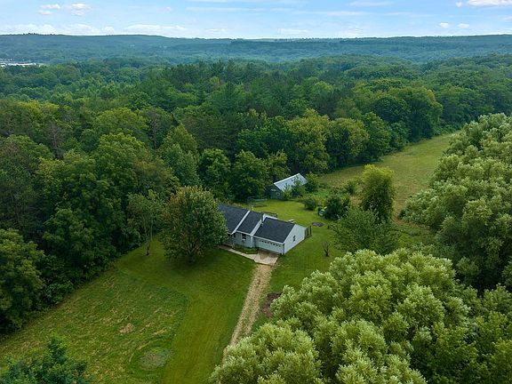 This charming two-bedroom ranch home offers room to grow indoors and out with over 4 acres. The main floor features an open great room with wood burning fireplace and large windows offering scenic views of both woods and pastures. The adjacent kitchen and dining area offer convenience and functionality. The master bedroom is generously sized with a cozy sitting area. The basement presents an opportunity for further expansion and is prepped for a full bathroom. Step out to a gardener's paradise through the walkout door and enjoy lilacs and mature trees throughout the property. Relax further outdoors from the covered front porch and 20x15 back deck. Home also features a roomy 2 car garage and is fully electric. New roof 2023, well pressure tank 2023. Outbuilding features electric, hydrant, and stalls with access to pasture. Come check out this one today!