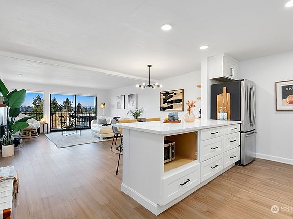 Wonderfully updated 2 bedroom, 1.75 bathroom condo in the heart of Greenwood! Excellent transit location, just 7 miles to Downtown & 5 miles to the UW campus. Newly updated kitchen features quartz counters, white shaker style cabinets, tile backsplash, large sink, updated lighting, stainless appliances, & more! The kitchen is open to the large living room with wood burning fireplace and west-facing balcony offering territorial & Olympic Mountain views. Both bathrooms have been updated including the ensuite primary bathroom with walk-in tile shower. Washer/dryer in-unit and plenty of closet space with an extra storage unit. Dogs/cats allowed. Covered parking. Rooftop deck, exercise room, game room & healthy HOA - this unit is a must see!